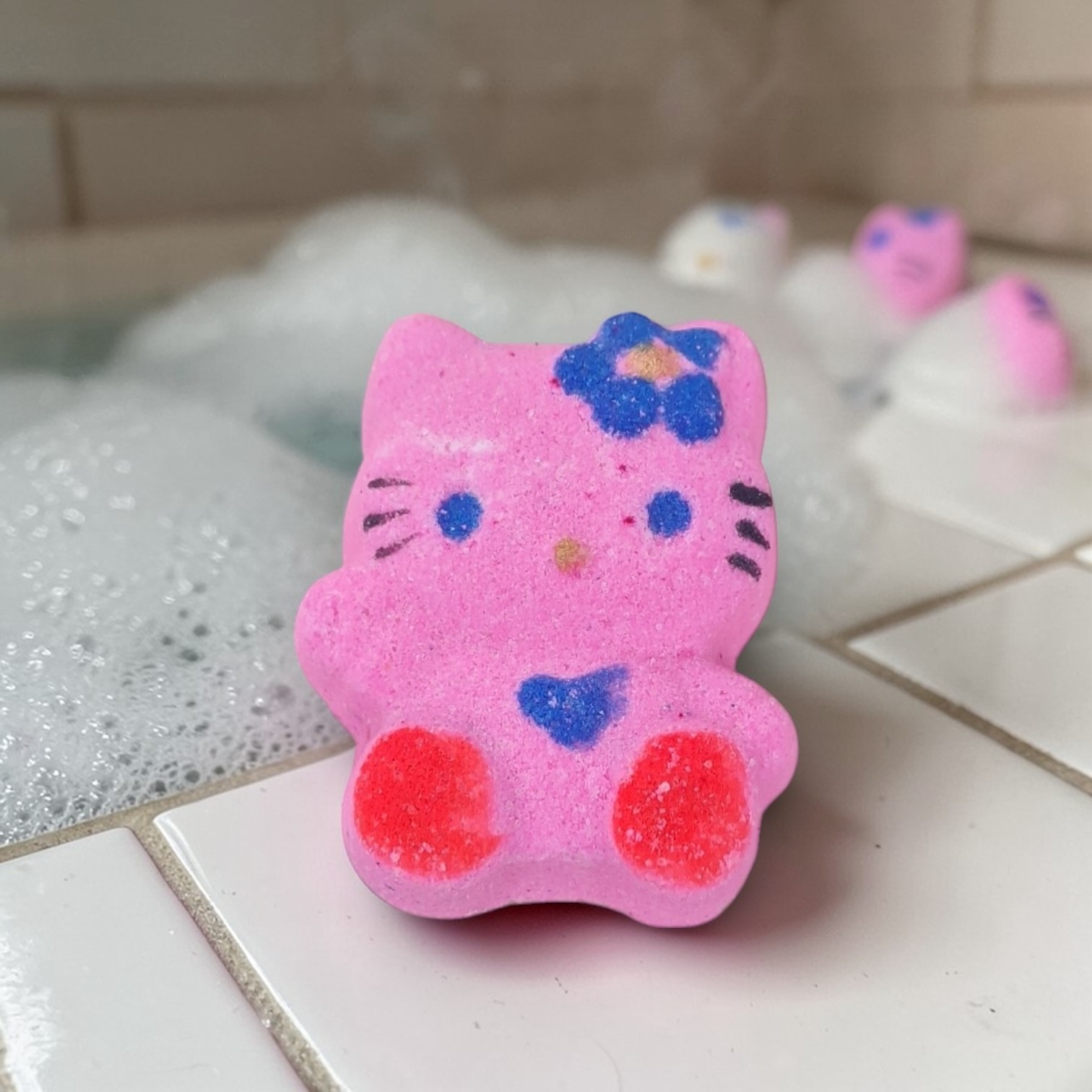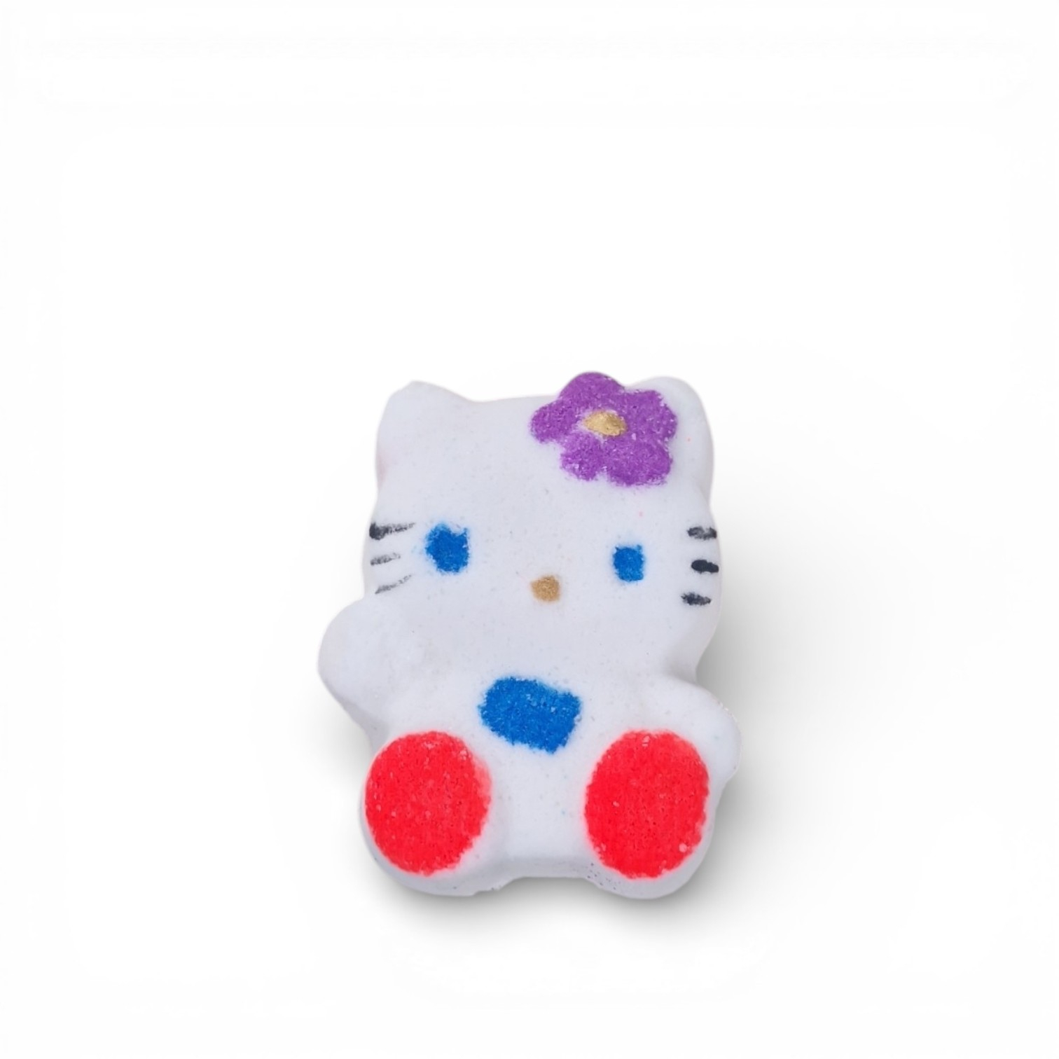 Este o bombă de baie efervescentă artizanală, în formă de pisică, care colorează apa în nuanțe curcubeu și creează o experiență de baie distractivă pentru copii.